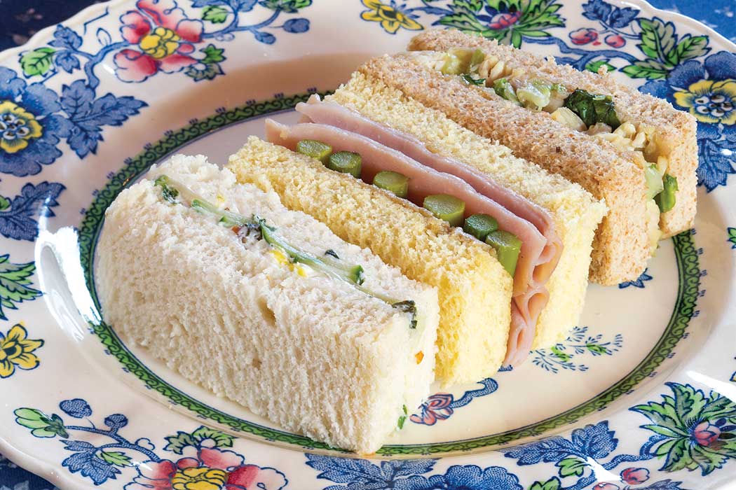 This delectable tea sandwich features honey ham and fresh asparagus between two slices of tasty potato bread. A flavorful, homemade Tahini Spread adds marvelous creaminess to the meat and vegetables. Pictured with our Cucumber-Herb Tea Sandwiches and Classic Chicken Caesar Salad Tea Sandwiches.