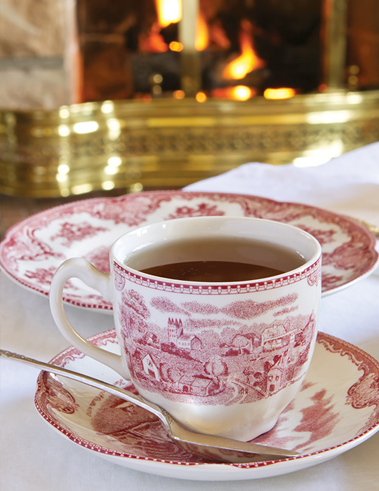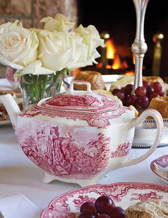 Resources included Johnson Brothers Old British Castles flat cup-and-saucer set, salad plate, teapot, covered sugar bowl, creamer, oval serving platter from Replacements Ltd., 800-737-5223. Tiered metal server from Pottery Barn, 888-779- 5176.
