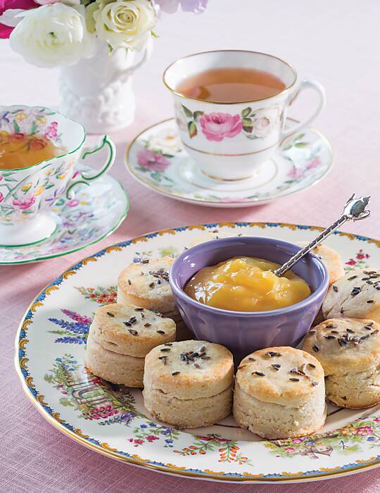 The luscious texture of these scones is largely due to the secret ingredient— cream cheese! Honey, which replaces the usual granulated sugar in the recipe, adds a perfect level of gentle sweetness, while culinary-grade lavender, which is pesticide-free, imparts a delightful floral fragrance and flavor, not to mention serving as a delicate garnish. Teatime guests may find it hard to eat only one scone, especially when warm and paired with lemon curd, as pictured, or with a favorite jam, such as raspberry.
