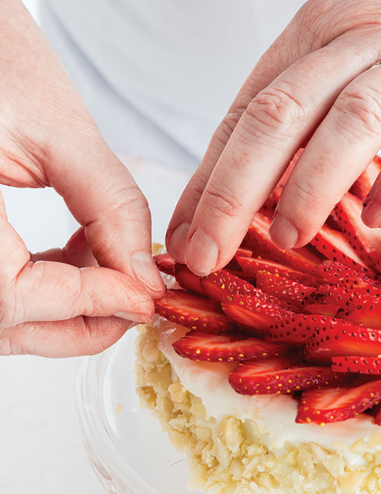Once top of cake is covered in strawberries, lift strawberries around outside edge and insert another row of strawberries to raise first row.