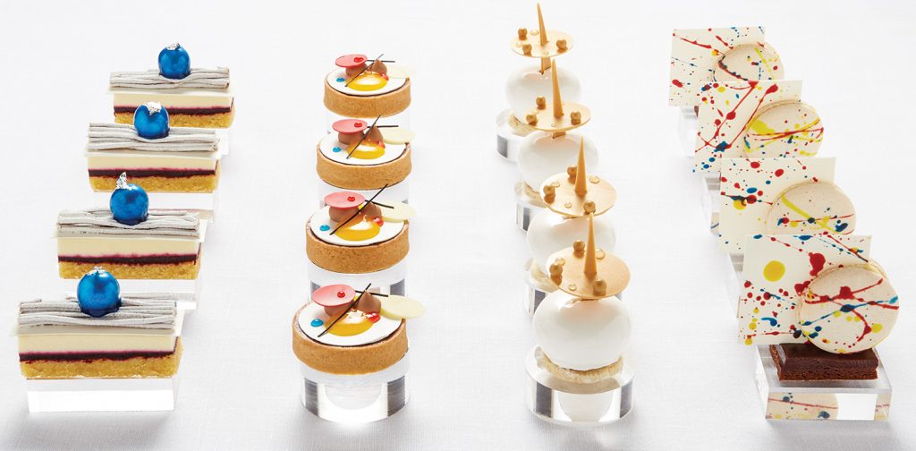 First to appear were piping-hot glass teapots filled with robust Darjeeling tea by the French house Mariage Frères, which sat center table with sides of sugar and steamy full-cream milk. The tea captain then arrived with flat trays of mixed crustless sandwiches—an eclectic mix of free-range chicken and tarragon mayonnaise, smoked salmon and lemon butter, brown egg mayonnaise and mustard cress, and the layered flavors of celeriac rémoulade, horseradish, and crisp Bramley apple. Scones with crumb as soft as silk followed, accompanied by strawberry-elderflower jam and clotted cream. Next, came the artsy pastries. This was one time when I really felt it a shame to eat them, beautiful works of contemporary pastry art created to emulate the works of each of the “fab five” designers.