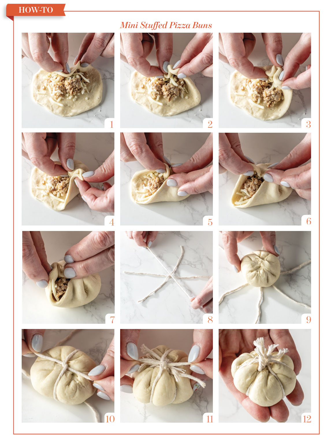 - Using a 2-teaspoon levered scoop, portion sausage mixture into center of each dough portion. Referring to how-to photographs, and working with one dough portion at a time, fold dough edges over filling into one central point, pinching edges together to seal bun (Photos 1 to 7 below).