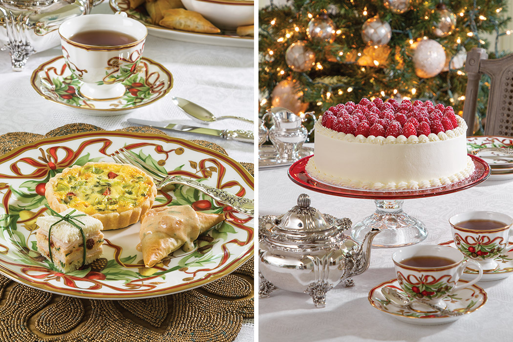 Loved ones gathered for teatime around a table that beautifully combines silver and gold along with classic red and green are sure to enjoy this enticing menu of sweet and savory treats.
