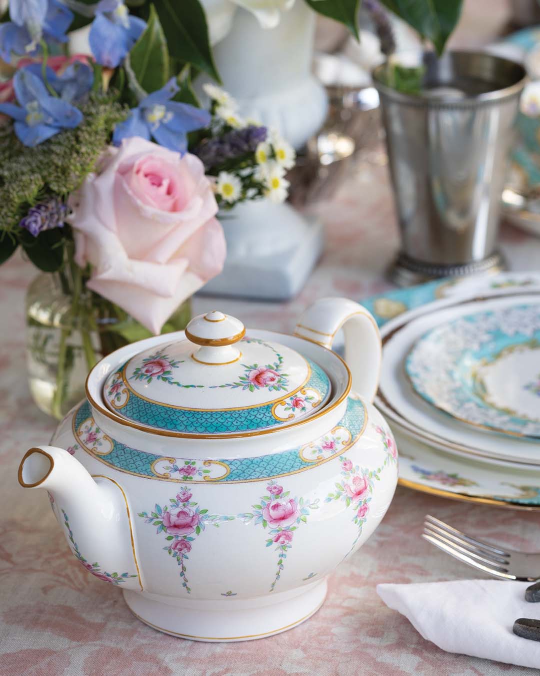 Minton Persian Rose (Older) teapot, square cake plate, 8-inch pedestal cake stand, 14-inch oval serving platter; Royal Albert Lady Ascot footed teacup and saucer set and dinner plates; Royal Albert Enchantment bread and butter plates; Ralph Lauren China Equestrian salad plate; Wallace Silver Rose Point salad fork, teaspoon, butter spreader, demitasse spoon, and small sugar tongs from Replacements, Ltd. Alderney Natural Pink linen table covering from Cabbages & Roses. Barfly julep cup and small cast-iron horseshoes from Amazon. Glass condiment bowls, glass cake stand, glass egg tray, vintage silver sugar and creamer set, antique napkins, and vessels for flowers from private collection. Location courtesy of Windwood Equestrian. Hats available from Polly Singer Couture Hats and Veils.