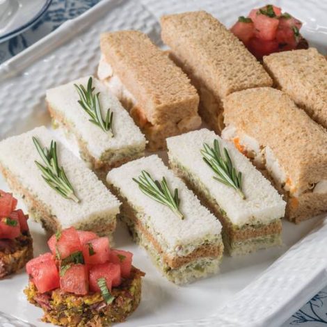 These Olive-Goat Cheese Tea Sandwiches are delightful in any season. Olive–Goat Cheese Tea Sandwiches pictured with Mandarin Orange & Cashew Chicken Salad Tea Sandwiches and Watermelon, Pancetta & Pistachio Canapés