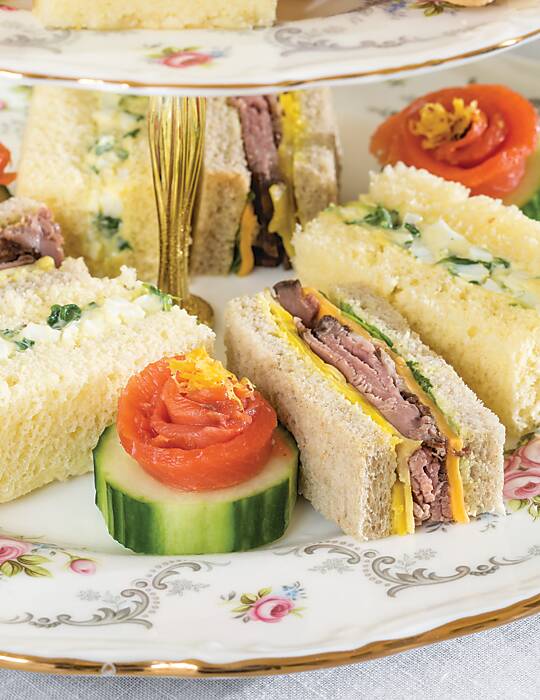 Strips of smoked salmon shaped into rosettes and placed into the wells of scooped-out cucumber slices make for a light, yet eye-catching, savory.