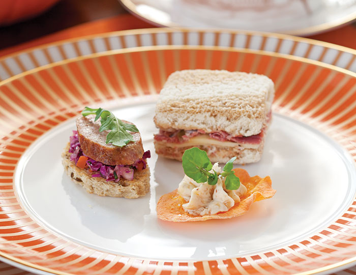 Pastrami and Swiss cheese are a welcome treat in Pastrami Tea Sandwiches.