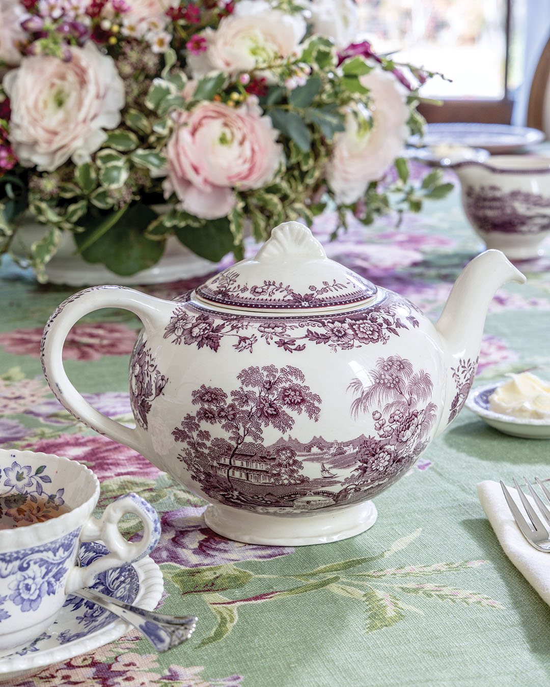 Royal Staffordshire Tonquin Plum teapot, creamer, covered sugar bowl, 3-tiered serving tray, and 11-inch oval serving platter; Spode Mayflower teacup and saucer set, salad plate, jubilee platter, 13-inch oval serving platter, and butter pat; Fostoria Corsage Plum iced tea glass; Oneida Silver Royal Flute salad fork, teaspoon, and butter spreader from Replacements, Ltd. Bella linen tablecloth and Blossom Toss embroidered tea napkins from April Cornell. Location courtesy of Haley Daniel.