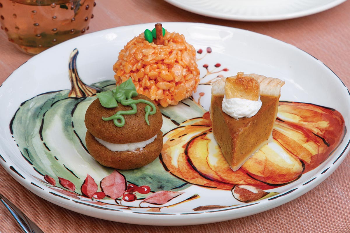 Cream cheese frosting serves as the filling for these rich and cakey sandwich cookies that are oh-so eye-catching, especially when decorated with green-hued frosting vines and leaves. Pictured with our Mini Pumpkin Pie Slices and Pumpkin Rice Cereal Treats.