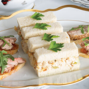 This simple crostini canapé features pork tenderloin and peach preserves, two foods Phyllis enjoyed. Although the pork tenderloin could be grilled, we started ours in a skillet and finished it in the oven. Pictured with Janice’s Chicken Salad Sandwiches.
