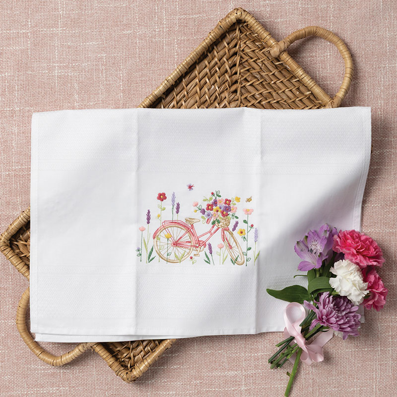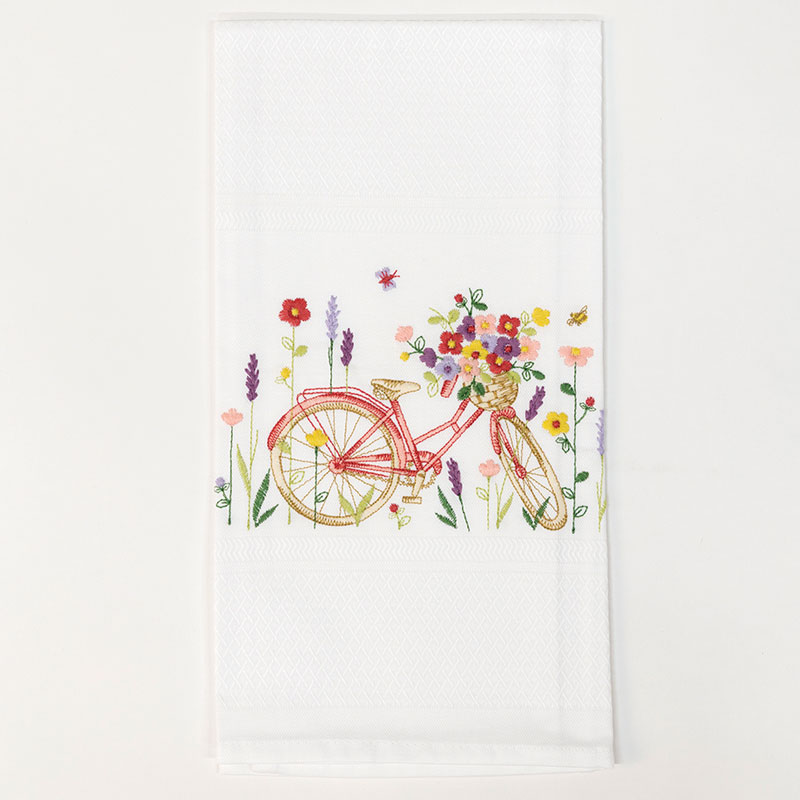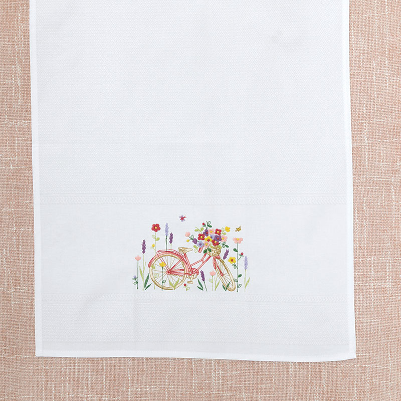 Tea towel with pink bicycle embroidery