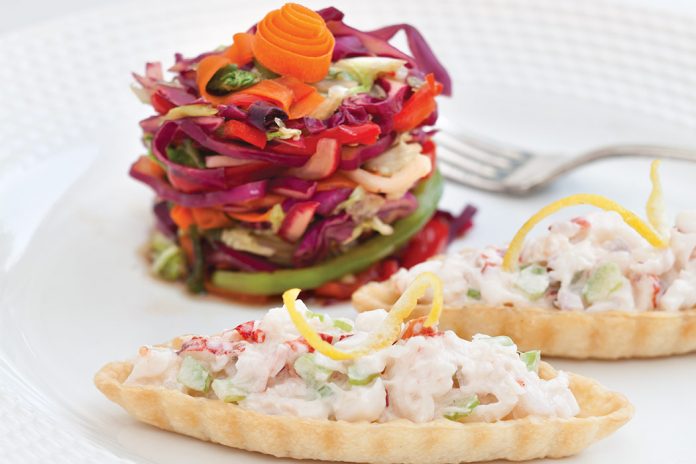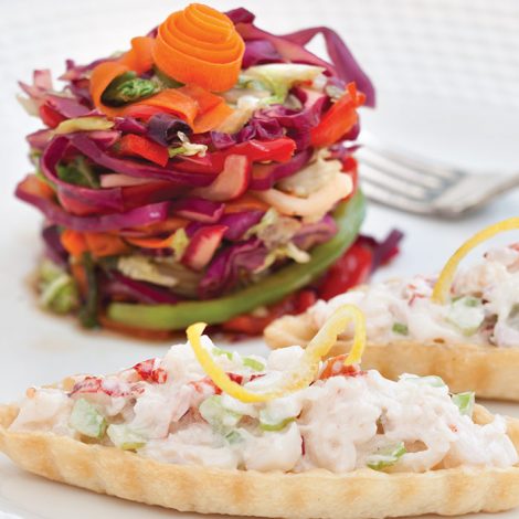 This savory Ribbon Slaw is a tasty blend of purple cabbage, Chinese cabbage, radishes, red bell pepper, green bell pepper, green onions, and carrots. Pictured with Lobster Salad Barquettes.