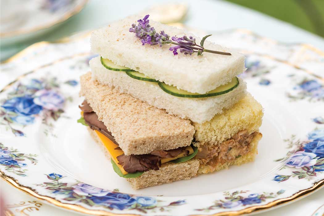 This petite-yet-filling bite of roast beef, cheese, watercress, and Chive-Horseradish Mayonnaise will have you wanting more than just one sandwich. Pictured with our Mint-Lavender-Cucumber Sandwiches and Curried Chicken Salad Tea Sandwiches.