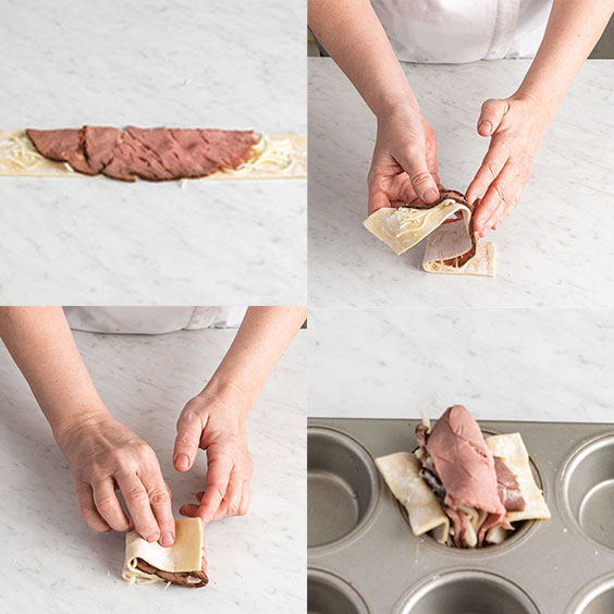 Strips of puff pastry are layered with a luscious aïoli, mozzarella cheese, and roast beef before being folded accordion style, placed in a muffin pan, and baked. Pictured with our Loaded Potato Twists.