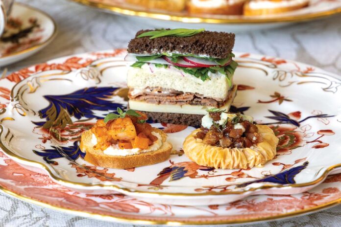 Triple-stack sandwiches, made with two kinds of bread (pumpernickel and white), feature layers of cheese, roast beef, radishes, arugula, and parsley, as well as a marvelously herbaceous aïoli with a touch of horseradish. Pictured with our Shrimp & Butternut Squash Crostini and Fig, Pancetta & Blue Cheese Savory Tartlets.