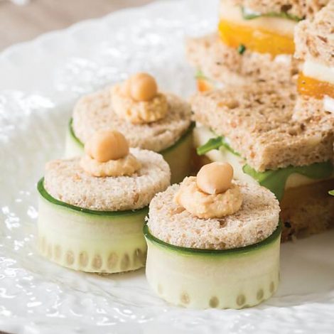 5. Using a 1¾-inch round cutter, cut 4 circles from each frozen bread slice. Spread approximately ½ tablespoon hummus onto 12 bread circles and top each with a remaining bread circle. Wrap a cucumber slice around each sandwich, using additional hummus to “glue” ends in place, if necessary. Cover with damp paper towels, and let bread thaw completely (approximately 15 minutes) before serving, or cover with damp paper towels, place in a covered container, and refrigerate for up to an hour until serving time.