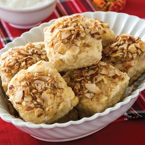 - In a medium bowl, stir together sliced almonds, brown sugar, and honey. Spoon almond mixture on top of scones, dividing evenly.