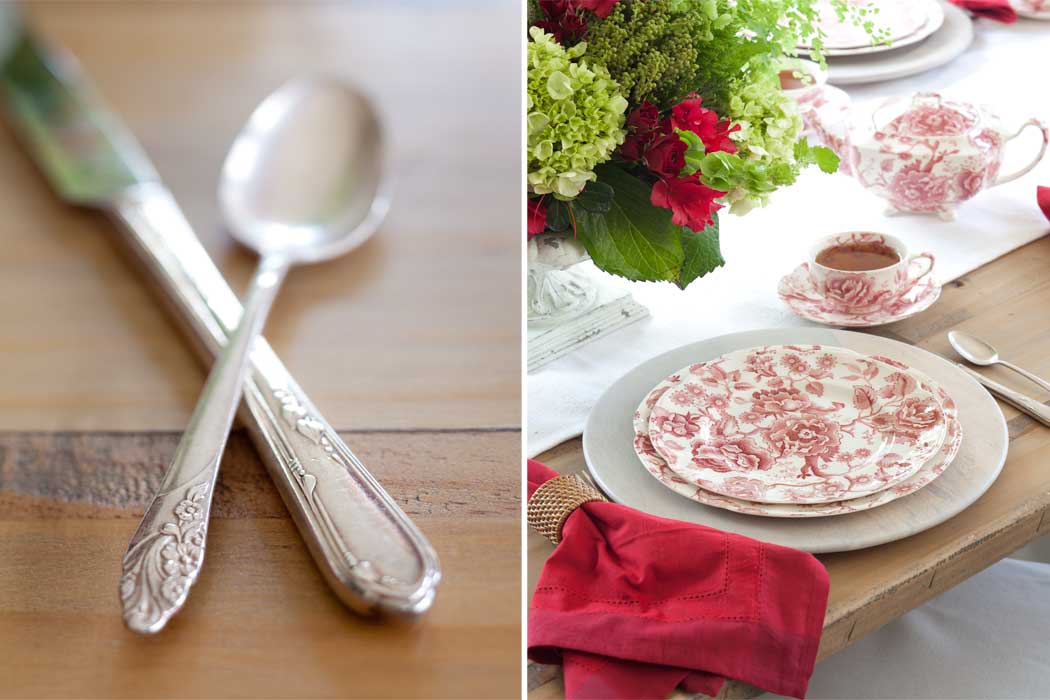 Simple mismatched vintage flatware pairs nicely with the china’s large-scale pattern and lends an effortless feel to your tablescape. Bright red linen napkins and basket-weave napkin rings add a bold splash of color beside the neutral table runner.