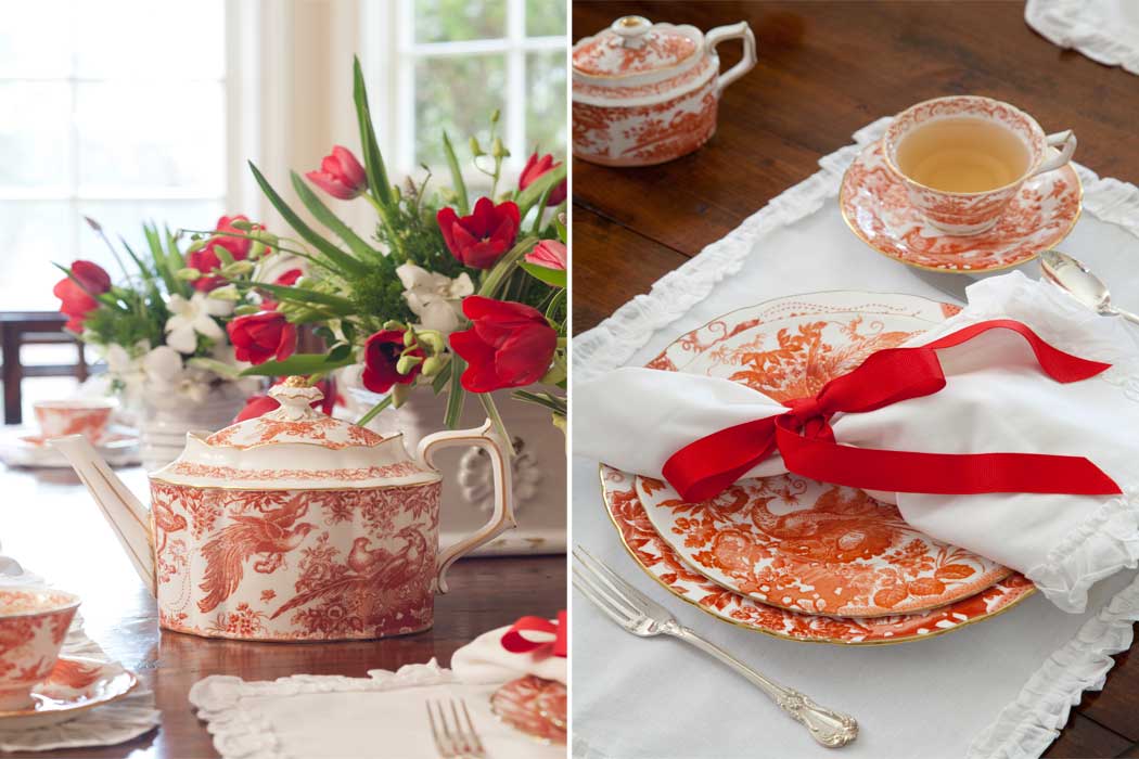 Royal Crown Derby Red Aves china looks its best with simple white place mats with a ruffled edge and coordinating napkins tied with a simple red ribbon.