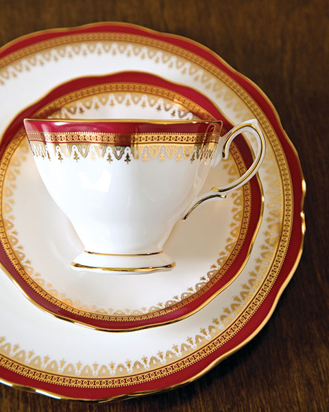 Britain’s royalty changed in 1936, bringing George VI to the throne, along with his bride, Elizabeth Bowes-Lyon, who became Queen Elizabeth. The king and queen gracefully led Britain through the beginning of World War II in the late 1930s and kept morale high. The soft, delicate Polka Rose pattern eloquently demonstrates the art deco style of the mid-1930s, while sweet polka dots and a single rose at the center of the dessert plate speak of the quiet charm of the time.