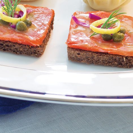 Pumpernickel bread, smoked salmon, and a fresh Mustard-Dill Vinaigrette make delightful canapés.