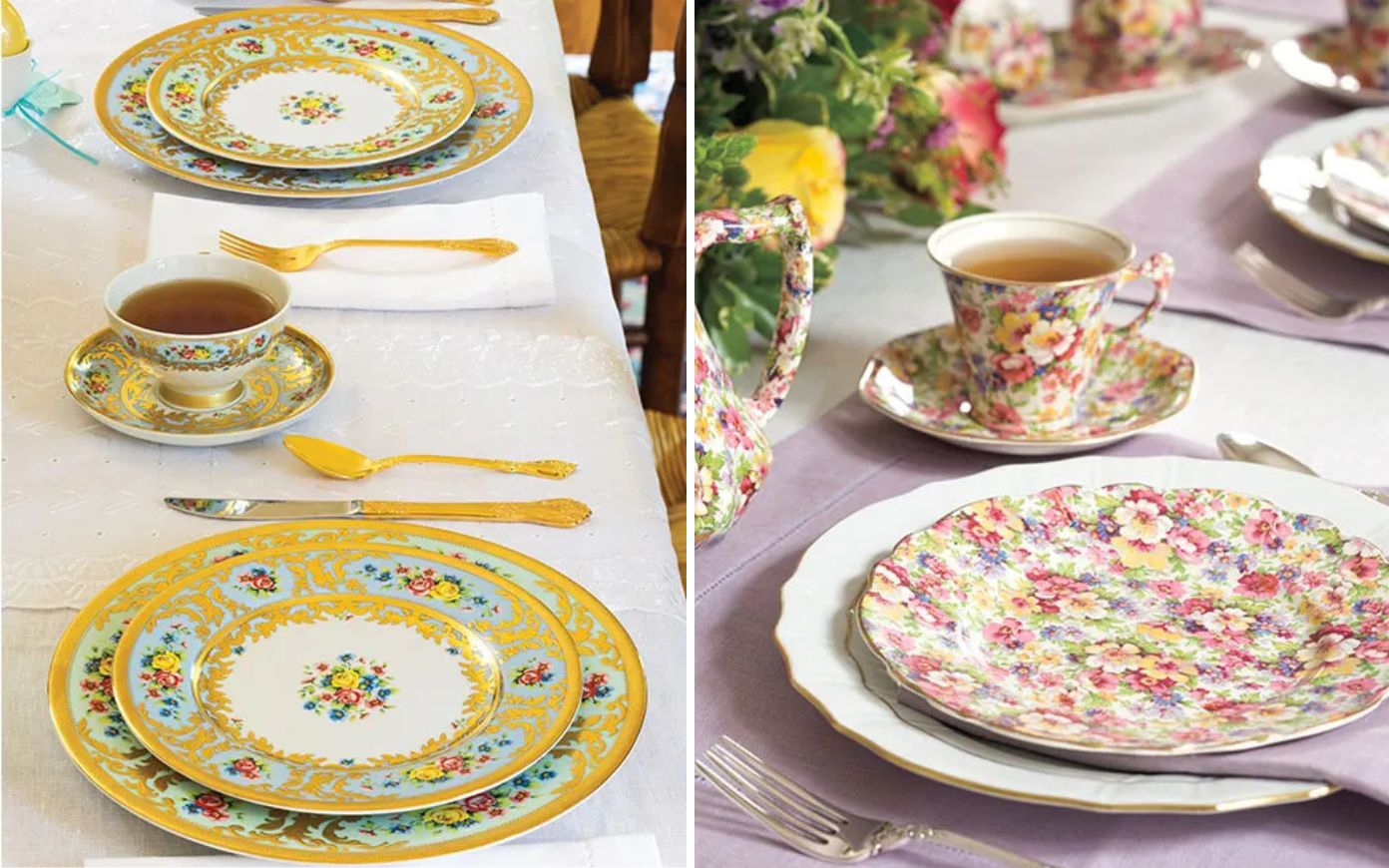 Choose a china pattern that complements the colors of spring. Above, left, the delicate gold and floral motifs of Constanza Vienna Blue by Old World Emporium add a touch of elegance to a pretty Easter table. Above, right, the classic chintz china pattern Dubarry from James Kent makes a bold statement.