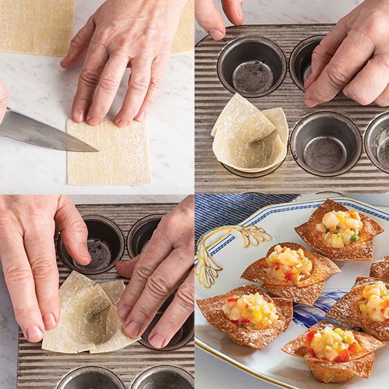- Using a sharp knife, make a 1-inch slit into each edge of a wonton wrapper. Carefully press center of wonton wrapper into a prepared well. Working clockwise, fold each slit of wrapper over the next. Gently press down corners of wrapper to adhere to top of muffin tin. Repeat with remaining wonton wrappers. Brush wrappers with 2 tablespoons olive oil, and sprinkle with 1 tablespoon salt.