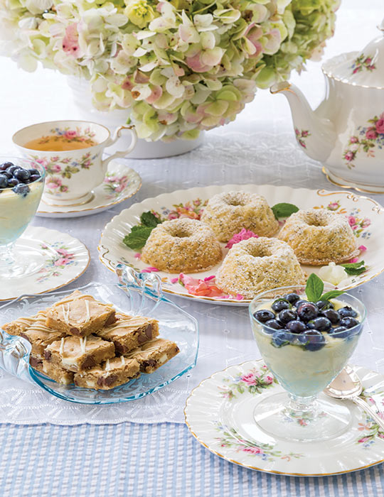 End your gracious occasion on a sweet note with a pot of Carriage House Tea’s Oolong Orange Blossom and our Lemon-Poppyseed Mini Bundt Cakes, Double Chocolate Blondies, and Blueberry-Basil Creamy Parfaits.