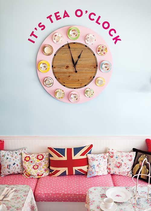 Whimsicality and playfulness abound at Crown & Crumpet. “Keep Calm and Carry On” and “Doily Free Zone,” signs proclaim. A large pale-blue clock, with floral teacups and saucers glued to its rim, suggests that it’s always time for tea. Dogs, a rabbit, and a raccoon sit at tea, while a giraffe and polar bear look on in charming artwork. Each saucer bears a quotation on tea or good manners to ponder, “Civility costs nothing and buys everything” (Lady Mary Wortley Montagu) or “Tea’s proper use is to amuse the idle, and relax the studious” (Samuel Johnson). Pink prevails, from heart designs on banquettes to table linens.