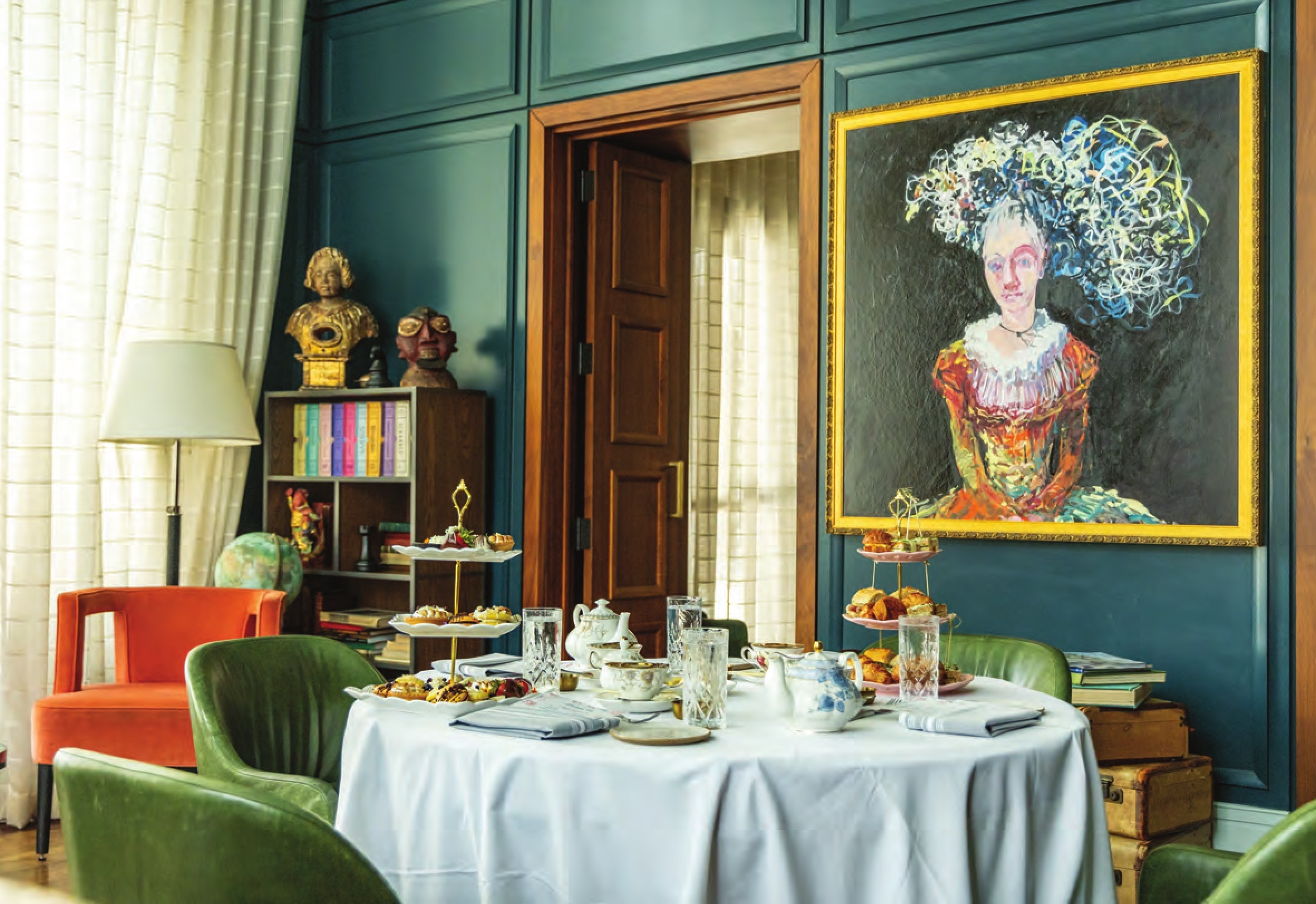 Inspired by the colorful adventures of Adelaide Harcourt, a fictional world traveler and seventh-generation Savannahian that was said to have donated countless family heirlooms and travel souvenirs to Perry Lane Hotel, the hotel’s library is filled with a collection of colorful, richly textured art. One such piece includes the beloved Flora painting by Deborah Brown, which is prominently displayed across from a stunning grand piano and surrounded by a variety of eye-catching sculptures and trinkets. The library effortlessly creates an atmosphere that is both sophisticated and intimate, and it is perfect for a casual afternoon spent reading books or enjoying a private tea party.