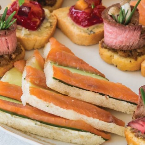 Smoked Salmon–Cucumber Canapés pictured with Plum Chutney-Blue Cheese Canapés and Mushroom-Steak Canapés.