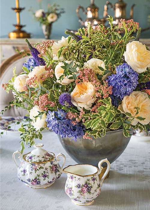 Royal Albert 100 Years of Royal Albert 1910 Duchess 3-Piece Tea Set; Royal Albert 100 Years of Royal Albert 1940 English Chintz Duchess 3-Piece Tea Set; Royal Albert 1900 Regency Blue teacup and saucer 3-piece set; Royal Albert 100 Years of Royal Albert 3-Tier Cake Stand English Chintz, Regency & Duchess from Wedgwood. DKNY napkins and Dainty Home Inc. tablecloth from HomeGoods. Centerpiece vase from Davis Wholesale Florist. Location courtesy of Katie Terry. Oneida oval platter and flatware, antique glass bowls for condiments, gold spoons, napkin rings, and small glass and silver vases from private collection.