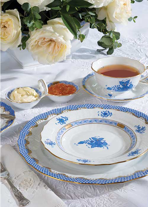 Herend Chinese Bouquet Blue teapot, teacup, saucer, square cake plate with handles, salad plate, twin salt dish, handled chop plate, sandwich tray, and large square bowl; Fish Scale Blue creamer, covered sugar bowl, dinner plate, bread and butter plate, oval platter, and square cake plate with handles; Golden Edge footed cake plate from Herend. Sheffield Original Kings pastry fork and teaspoons; Wallace Silver Impero butter spreader; antique linens; sugar tongs; and cake server from private collection.