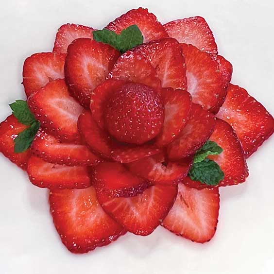 - Garnish: gold and white sparkling sugars, sliced fresh strawberries, and fresh mint leaves