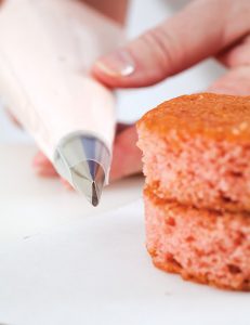 - Using a 2¼-inch round cutter, cut rounds from cooled cake. Place one cake round on a cardboard quarter, and spread 1 teaspoon Strawberry Buttercream on top. Top with another cake round, pressing cakes together. Repeat with remaining cake rounds and cardboard quarters.