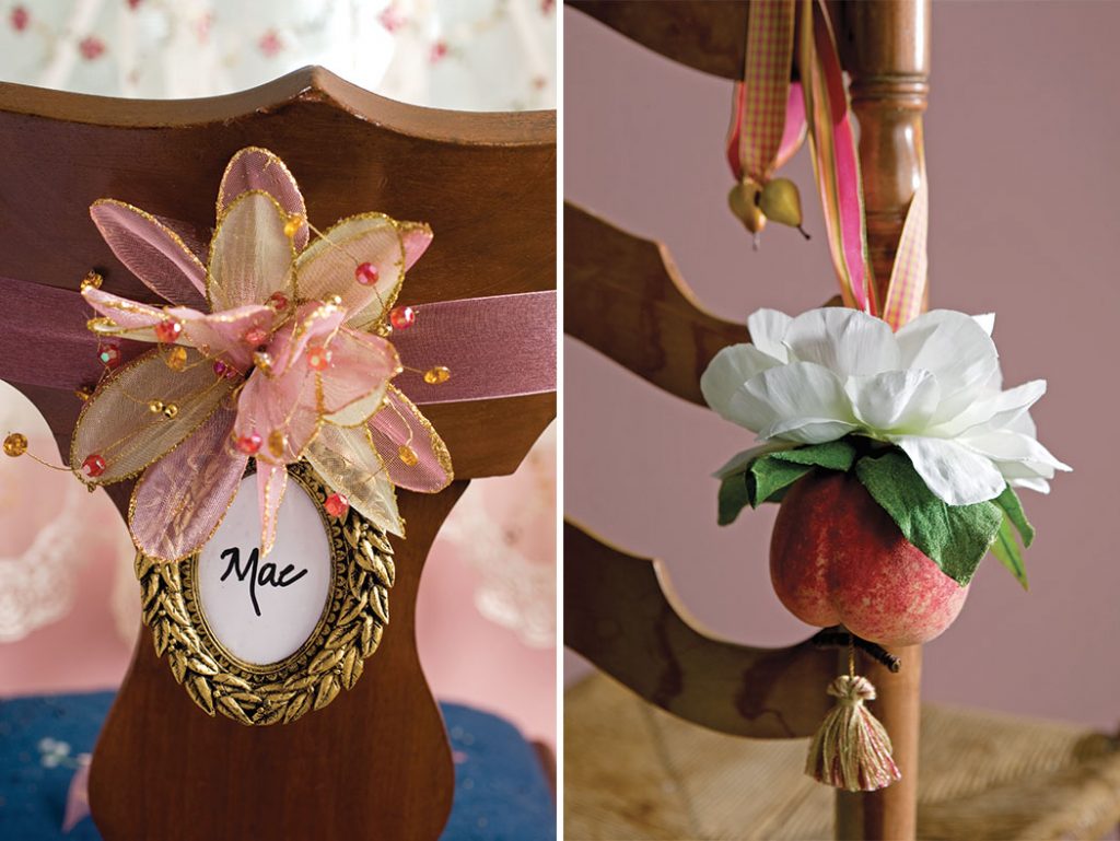 Chair embellishments are a wonderful way to add thoughtful detail to a table. When including colors and creative elements corresponding the table theme, these decorations can be the final touch that pulls your tablescape together.