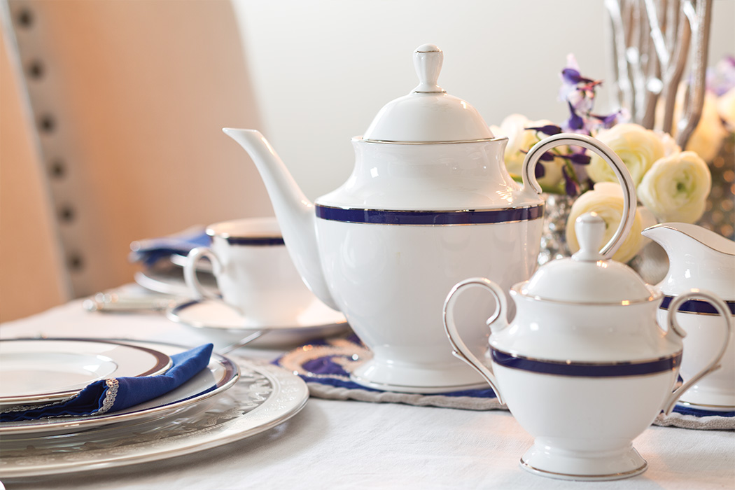 Resources include Lenox Federal Cobalt Platinum flatware 5-piece place setting, creamer, sugar, teapot, and 16″ oval platter from Replacements Ltd. Arte Italica Vetro Silver charger and water glass; Giglio flatware 5-piece place setting from Arte Italica. Classic Belgian Flax Linen Hemstitch tablecloth from Pottery Barn. Silver beaded table runner, twig menorah, and blue napkins with silver edge from Pier 1 Imports. Godinger Dublin 3-tiered server from Belk.