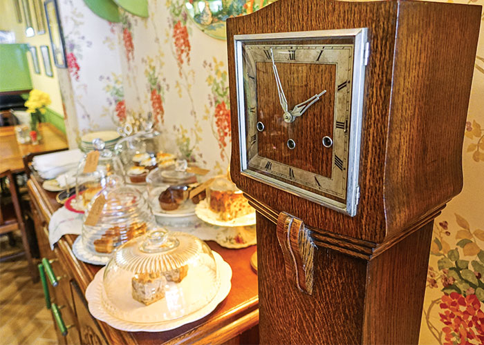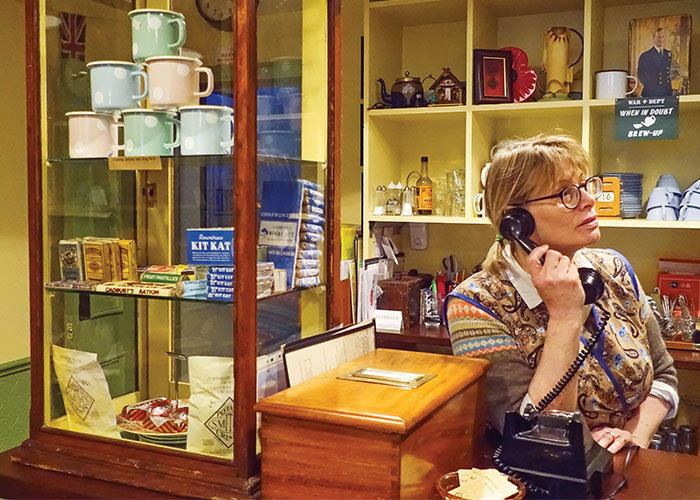The room is beautifully styled with original furniture, touches of Art Deco, framed sheet music of popular ’40s songs, china ducks in flight on the wall, a Bakelite radio that plays favourite big band numbers, an original black-and-white television that plays silently in the background, a coat rack with gentlemen’s hats and coats, Union flag bunting, and an original ’40s brush and pan for sweeping up the crumbs. Even the light switches are genuine originals, and the staff all wear 1940s pinafores. The lovingly crafted menu lists wartime staples such as Spam and corned beef sandwiches; pilchards on toast; jelly and tinned peaches with ice cream, evaporated milk, or custard; crumpets; and toasted tea cakes. And as well as good old builders’ tea and other loose-leaf teas (no teabags in those days, of course), there’s malty comforting Ovaltine, savoury hot Bovril, fizzy fruity Vimto cordial, Tizer (a citrus and red fruit soft drink very popular with children in the ’40s and ’50s), and ginger beer—all so very reminiscent of British childhood and life in the 1940s.