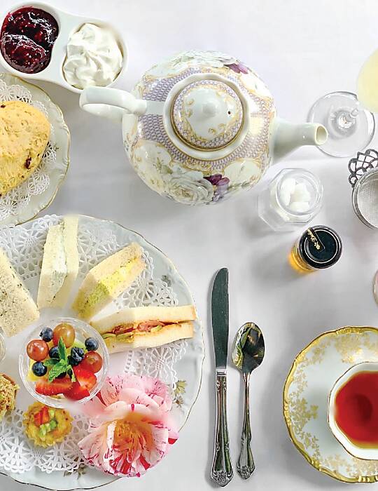 At The Tea House on Los Rios, guests can choose from four afternoon-tea services, entrée salads, savory fare, and various desserts. The options, ranked from the most lavish and hearty to the smallest portion size, include The Royal Tea ($69 per person), The Victorian Tea ($49 per person), The Mission Tea ($42), and The Garden Tea ($37 per person.) Each service offers a freshly baked, heart-shaped currant scone accompanied by raspberry preserves and “Early California Cream”—a signature blend of clotted cream and crème fraîche, assorted tea sandwiches (like cucumber with herbed cream cheese and egg salad with chive), fresh fruit served with brown sugar and cream, a delightful selection of petit fours, and, of course, a pot of tea. The additions of a specialty soup, a garden salad, extra sandwiches and sweets, and a glass of Veuve Clicquot Champagne increase the level and price of the preferred service.