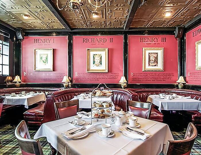 Anglophiles will adore that afternoon tea at Ye Olde King’s Head remains quintessentially English regardless of its location. The Traditional Tea Service, for $30 per person, features a scone served with Devonshire cream, a medley of vegetarian and meat-filled tea sandwiches, a cocktail sausage roll, a quiche, a few pastries with petit fours, and a delightful Victoria sponge. The Royal Tea, available for $35 per person, includes the aforementioned items along with a glass of Champagne. The prices for both services might be slightly higher on special occasions. The tea choices offered at the tearoom are British favorites, of course, from well-known brands, like Twinings, Taylors of Harrogate, and Barry’s Tea, with English Breakfast and Earl Grey being the most popular. Green teas and herbal blends are also available.