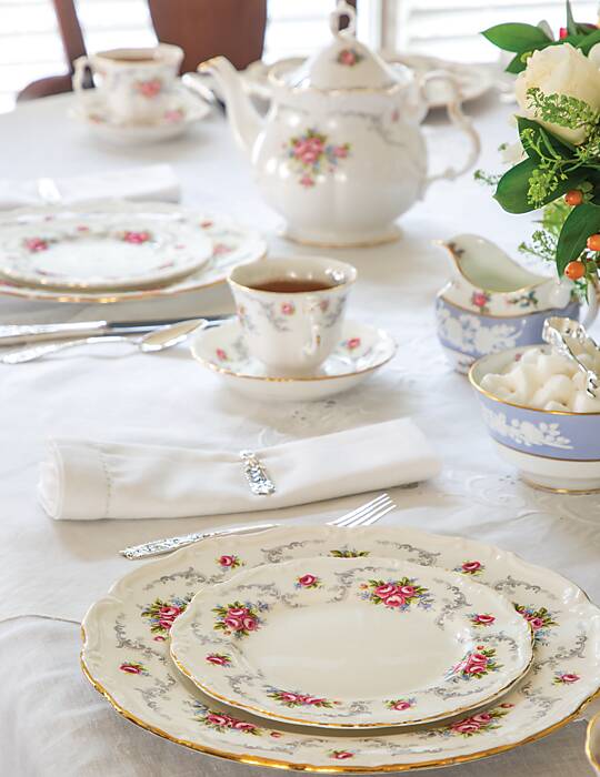 Royal Albert Tranquillity teapot, dinner plate, dessert/pie plate, footed cup and saucer set, and 3-tiered serving tray; Spode Maritime Rose Blue creamer, open sugar bowl, and 8-inch oval vegetable bowl; Westmorland Silver Milburn Rose 9-inch modern hollow knife, individual salad fork, teaspoon, napkin clip, and small sugar tongs from Replacements, Ltd. Libeco Fjord Washed tablecloth from Libeco Belgian Linen. Madison Studio napkins from HomeGoods. Floral arrangement by Lindsey Harrington at No.5 Floral Design. Vintage glass bowls, tablecloth overlay, and silverplate vessel for centerpiece from private collection. Location courtesy of Melissa Lester.