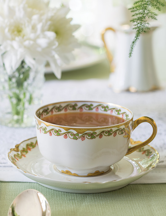Resources include Haviland Clover Leaf teapot, creamer, sugar, salad plate, bread and butter plate, handled cake plate, 13” oval platter, 9” serving bowl; Royal Worcester Regency Green & Gray dinner plate, soup bowl/saucer set, 15” oval platter; Reed & Barton Marlborough knife, salad fork, teaspoon, soup spoon, and demi spoon from Replacements, Ltd. Tablecloth from April Cornell. Napkins from Boutross Fine Linens. Runners, vases, and condiment dish from private collection.