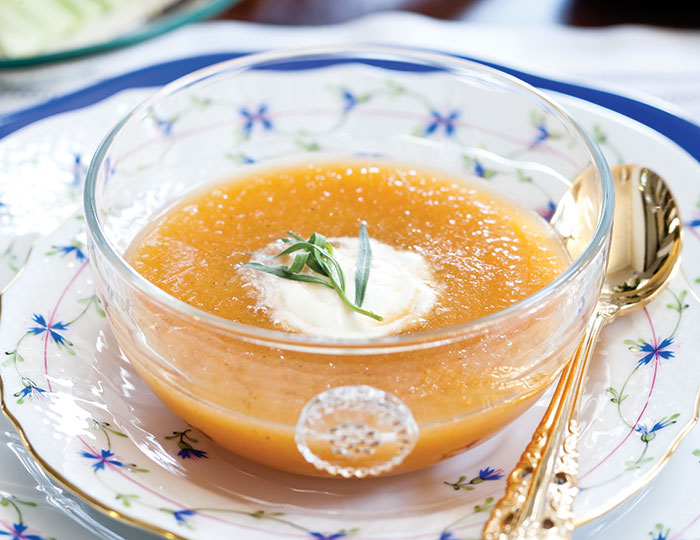 A cold Tarragon-Cantaloupe Soup is a refreshing start to the savories course on a hot summer day, and Simpson & Vail’s Special Blend tea is the perfect accompaniment.