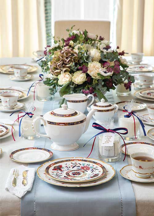 Seyei Dochester footed cup and saucer, dinner plate, and salad plate; Royal Worcester Prince Regent teapot, 13-inch oval serving platter, accent salad plate, bread and butter plate, tureen for flowers, 16-inch oval serving platter, cake plate, round compote, and rectangular tray; Royal Worcester Mountbatten Cobalt Blue covered sugar bowl and creamer; Georg Jensen Cactus teaspoon, pastry fork, butter spreader, demitasse spoon , and pastry server from Replacements, Ltd. White Tea and Ginger candle from STACK Candles. Glass bowls for condiments, antique napkins, tablecloth, and table runner from private collection.