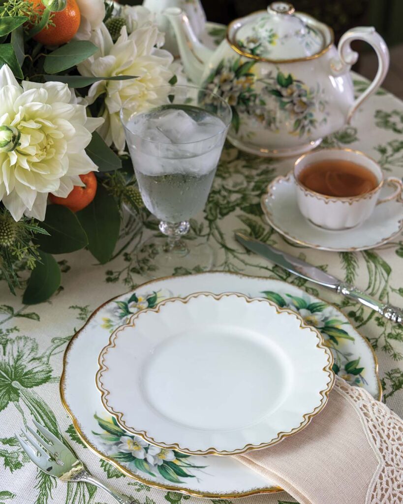 Royal Albert Orange Blossom teapot, dinner plate, 15-inch oval serving platter, and handled bon bon dish; Haviland Schleiger 305 flat teacup and saucer set, salad plate, and 2-tiered serving tray; Haviland Schleiger 150b covered sugar bowl and creamer; Reed & Barton Francis I modern hollow knife, salad fork, teaspoon, sugar tongs, and demitasse spoon from Replacements, Ltd. April Cornell Bienvenue tablecloth and Versailles napkins from April Cornell. Haviland Schleiger 52c bowls for condiments, rectangular tray for roulade, green linens, water glasses, and vessel for flowers from private collection. Location courtesy of Casey Snipes.