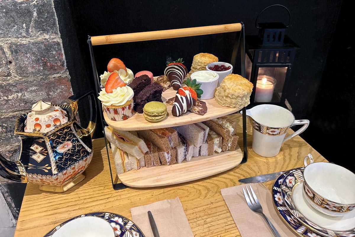 When Liz and Siobhan won the lease on the house in 2022, their plan was to create a tearoom with the sort of atmosphere in which they and their families would feel comfortable. So, they have kept it simple but homely and inviting. On the ground floor, an open hearth, white walls, a polished wooden floor, and pale wood furniture combine to create an interior that really does suit everybody, and the mix-and-match antique china wares from different periods add their own charm. Blackboards give details of the menu, and the display of cakes is immediately attention-grabbing. There is something for everyone, even for really difficult dietary requirements, such as gluten- and dairy-free. The scones and cakes are all baked on the premises and sit on the counter so temptingly that it’s almost impossible to resist! A delicious afternoon tea is also available with 24 hours notice.