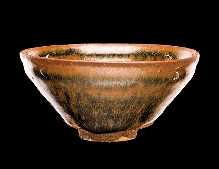 When we think of Chinese tea bowls today, we perhaps envisage the delicate white or pale-coloured porcelains that so artfully display the liquors of green and oolong teas. But during the Song Dynasty, tea bowls were glazed in dark colours. This is because white teas, made from the buds of wild tea trees, became very fashionable at court and were a favourite of Emperor Huizong. A book titled Chalu (The Record of Tea), written between 1049 and 1056 by Song scholar Cai Xiang, recommended the most suitable bowls for drinking these teas: “The tea drink is white in colour, and therefore should be contained in black cups. The froth of the tea is seen most clearly in a tea bowl with black glaze. . . . Its relatively thick body makes for a good way to keep the temperature of tea warm.”