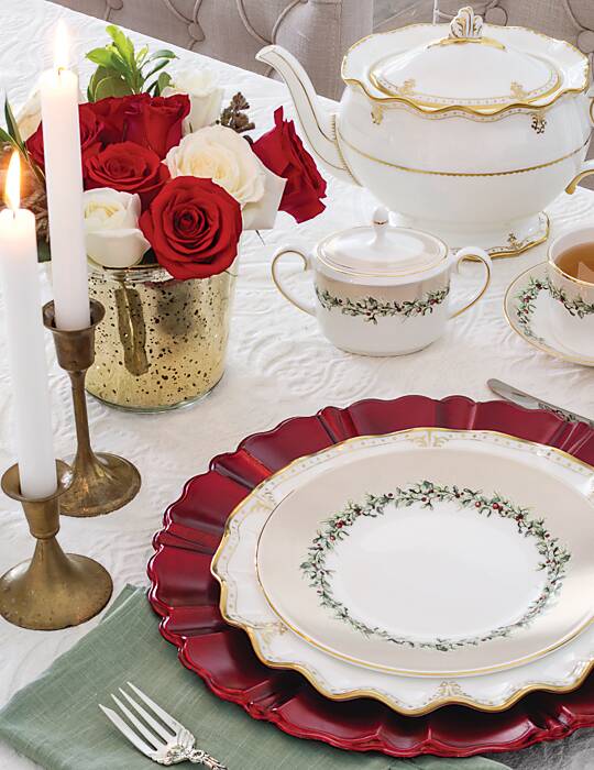 Elizabeth’s dinner plate and teapot pair well with a deep-hued charger and Wedgwood’s Holly Wreath salad plate, sugar bowl, and cup and saucer for a Yuletide affair. Let the intricate handles of Whiting Division’s Lily flatware serve as the final touch for this merry teatime tablescape.