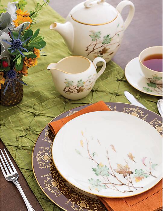 The intricate gold design on Haviland’s Residence Chocolate dinner plates establishes a formal ambiance. Dress up the table with rich solid-color napkins and a contrasting bold table runner.