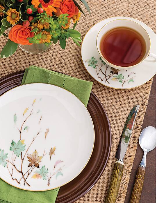 The Complete Table: Leaves an Impression October 23, 2020 FacebookTwitterPinterestWhatsApp Rustic The harvest hues of Lenox’s Westwind pop against a dark, monochromatic dinner plate such as Fiesta’s Chocolate and, along with Vagabond House’s Horn Rustic flatware, create a quaint, rural setting for tea.